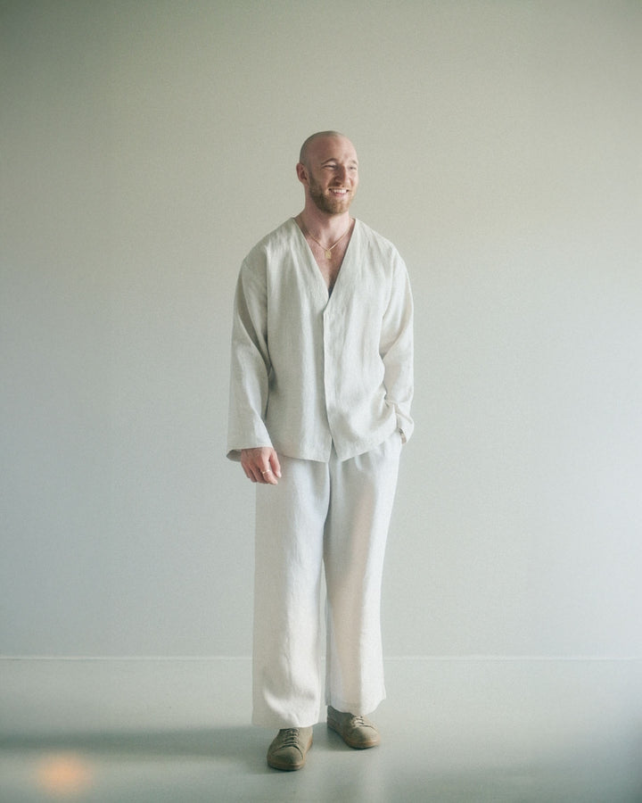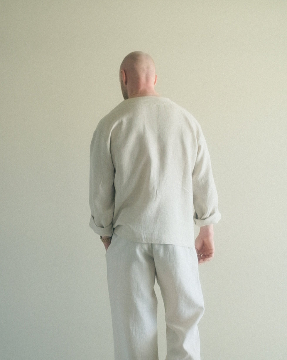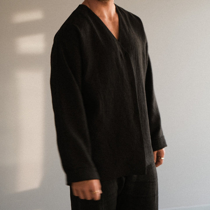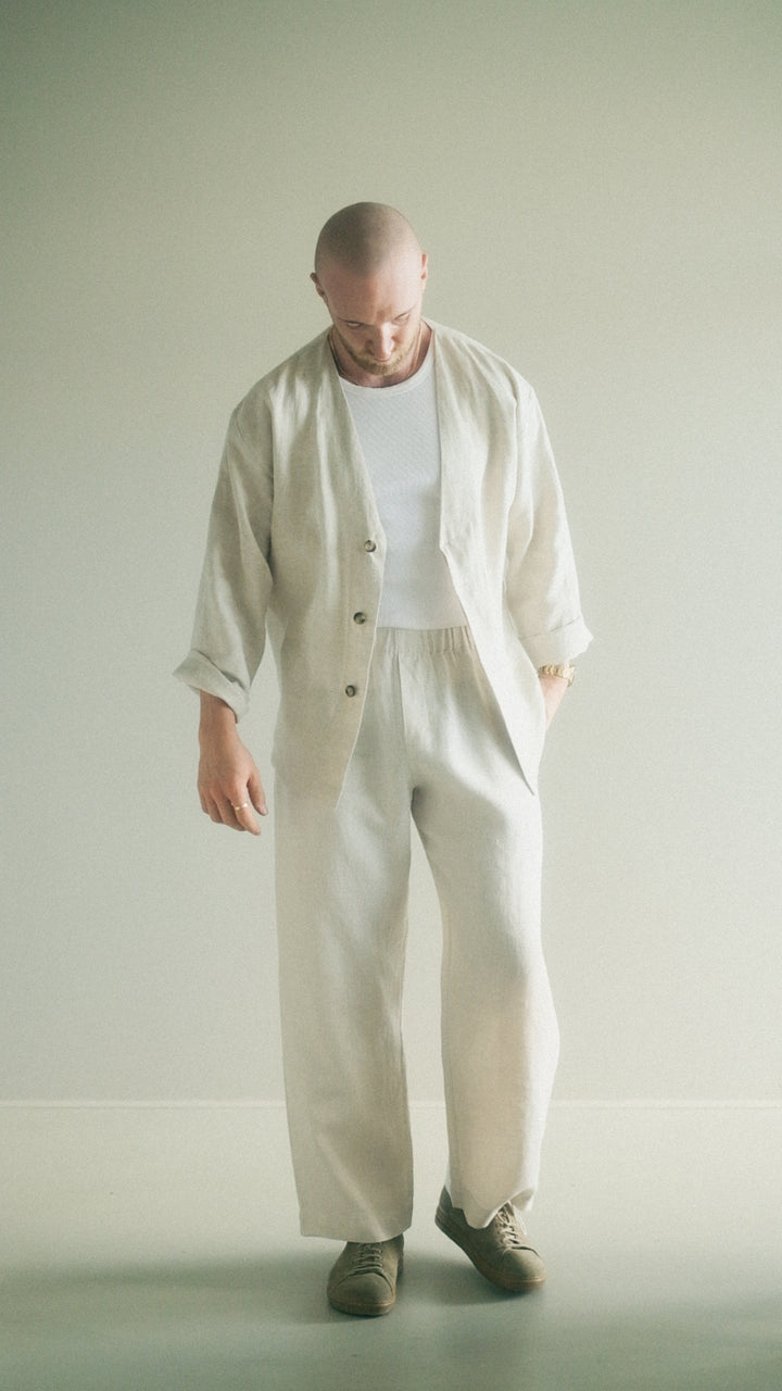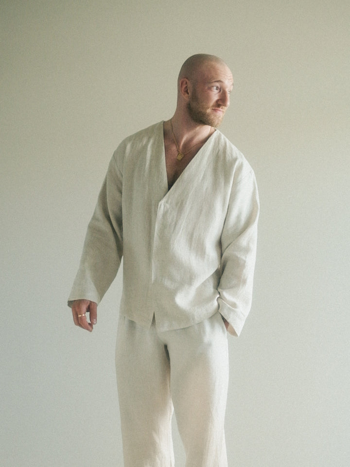 A kimono-inspired jacket with a relaxed cut and clean lines. The linen gives it structure without stiffness, making it a piece that moves gently through both everyday moments and more dressed occasions. Facing is stiched by hand.