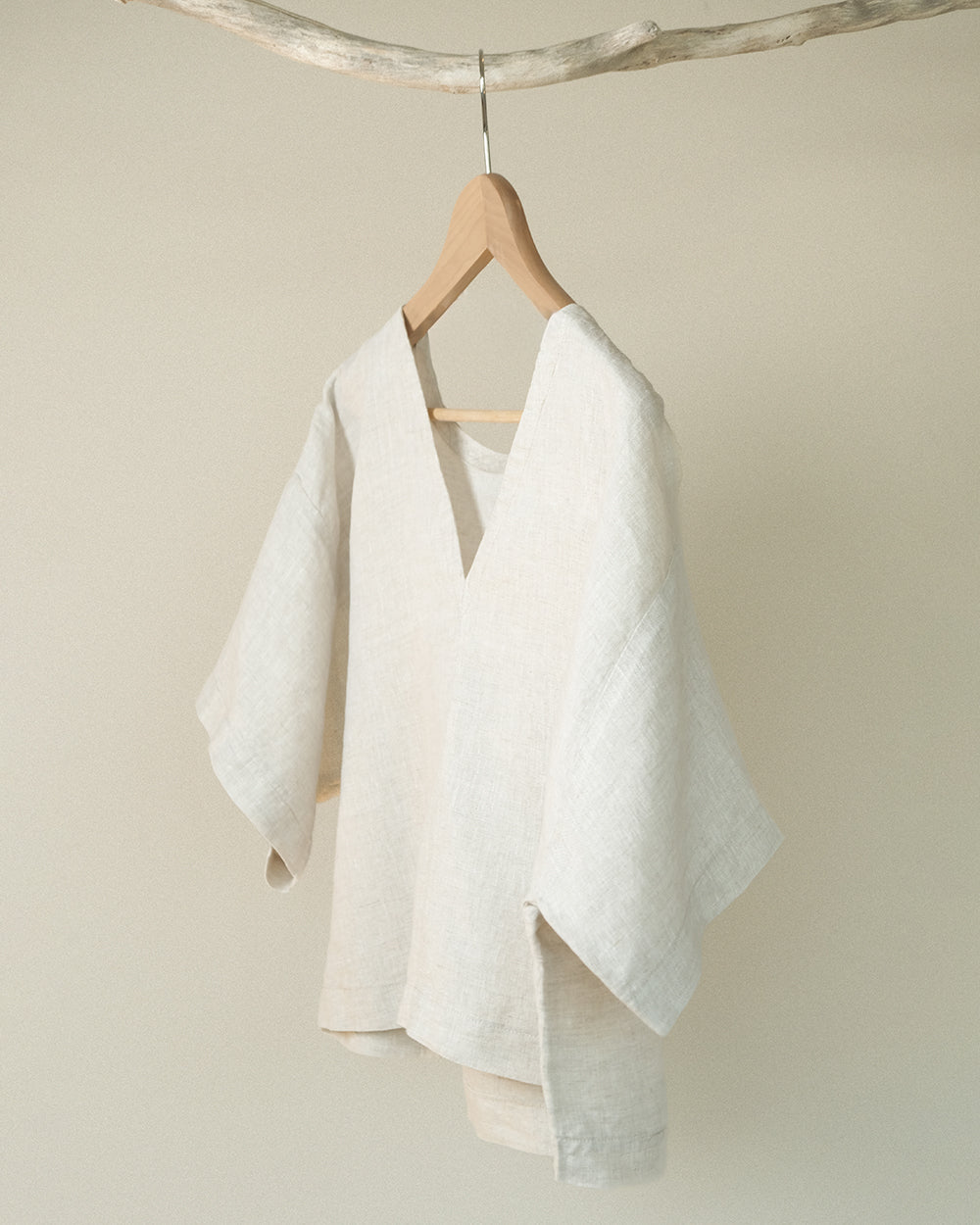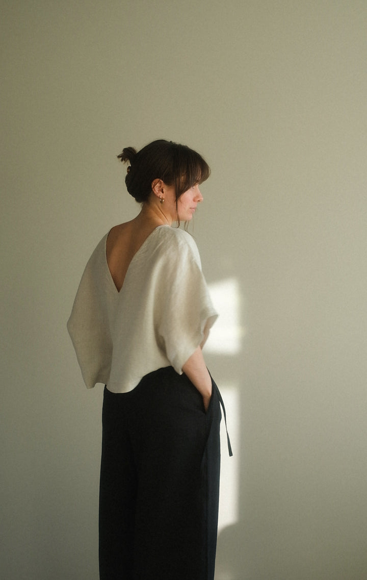 A top is designed to be worn two ways. One side features a v-neckline, the other a subtle scoop, giving you flexibility to wear as you prefer. Made from 100% linen with a gentle drape. A simple, seasonless piece for layering or wearing on its own.